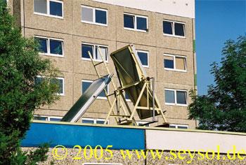 Der eine ist auf einem Gestell montiert, dessen Höhenwinkel man auf typische Dachneigungen einstellen kann.