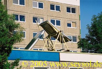Der eine ist auf einem Gestell montiert, dessen Höhenwinkel man auf typische Dachneigungen einstellen kann.